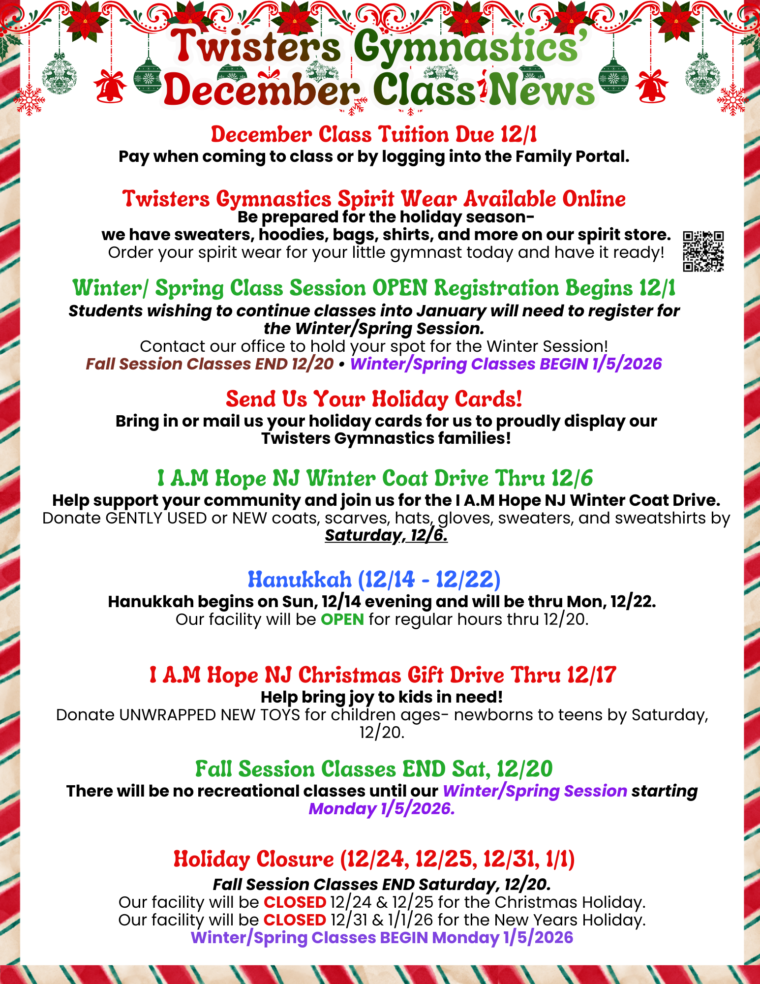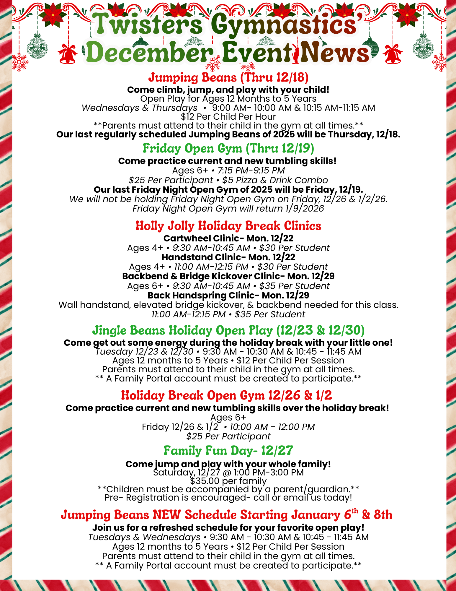 We will not be holding Friday Night Open Gym on Friday, 12/26 & 1/2/26.